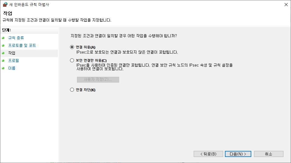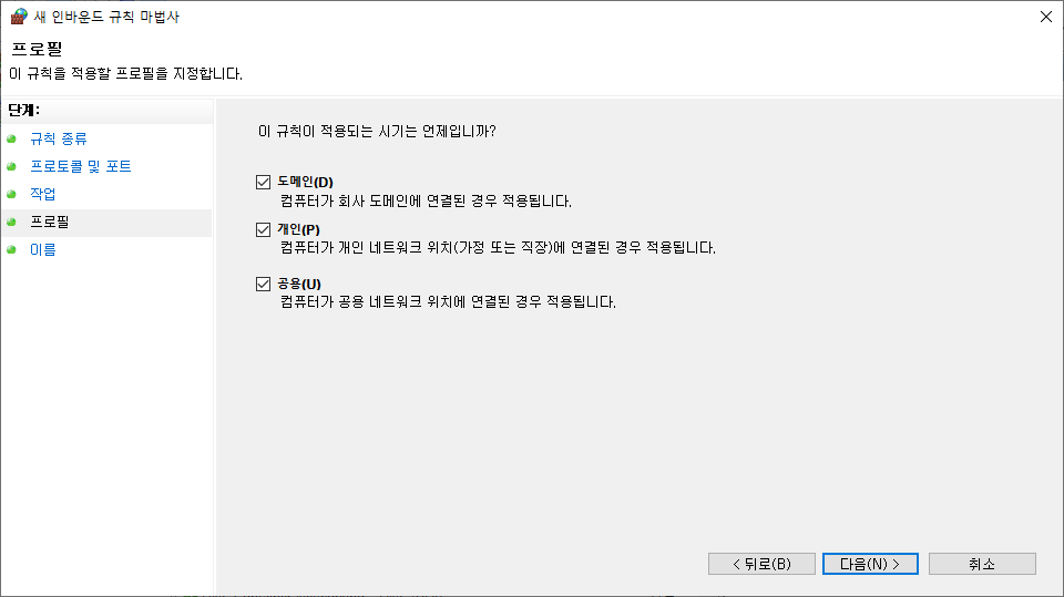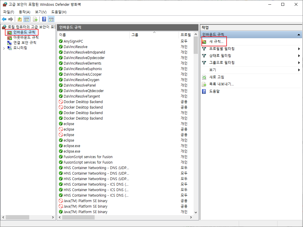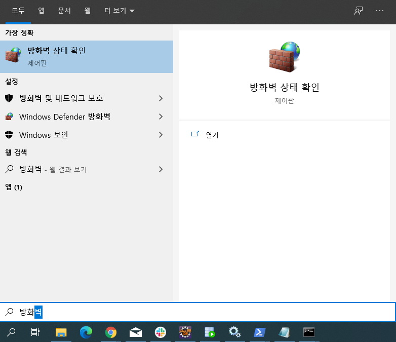 시작에 방화벽을 치고 방화벽 상태 확인을 누릅니다.