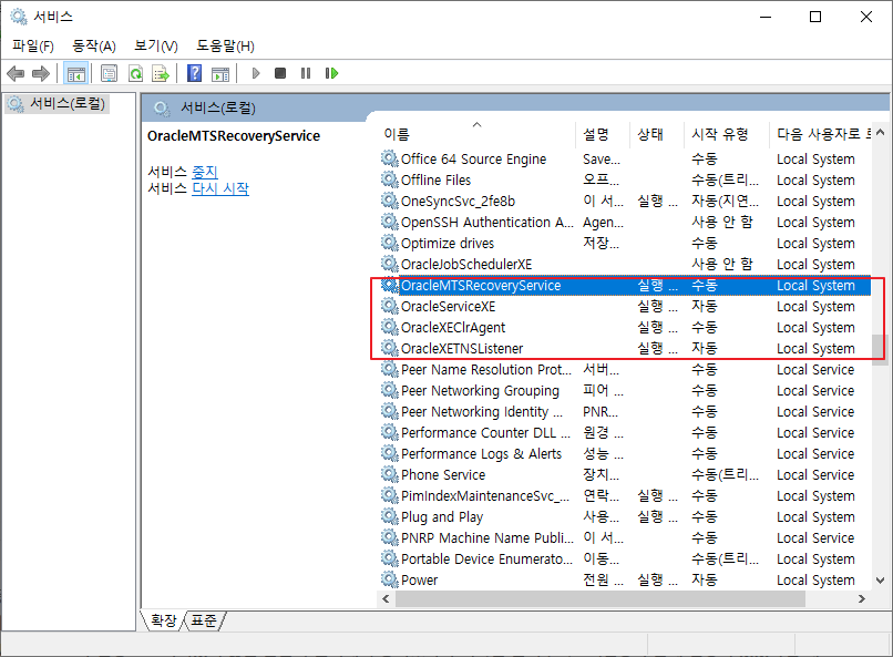 오라클 서비스가 실행 중인지 활성화돼있는지 확인하겠습니다.