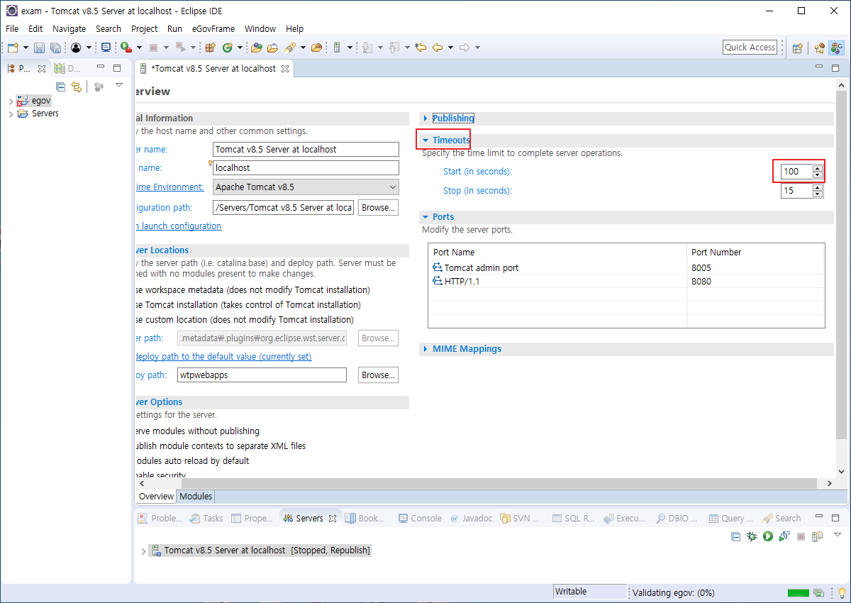 Server Tomcat v8.5 Server at localhost was unable to start within 45 seconds. If the server requires more time, try increasing the timeout in the server editor.