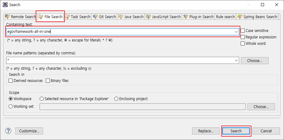 프로젝트 클릭 > Ctrl + h를 눌러 검색창을 열고 File Search 탭에서 egovframework-all-in-one으로 검색한다
