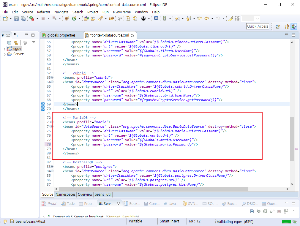# context-datasource.xml 에서 Globals.mysql.Password}"/>로 바꾸어 주어야 함