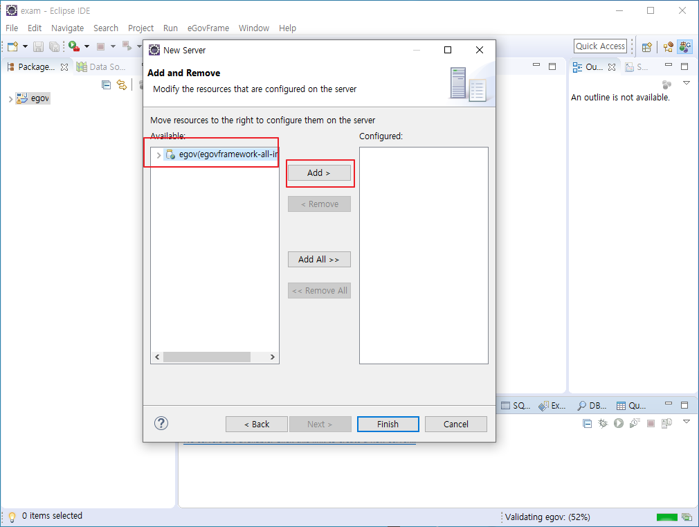 egov > add > Finish 순대로 누른다.