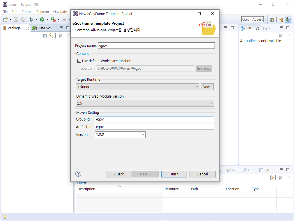 Project name, Group Id를 입력해준다 여기서 egov로 입력함 Finish