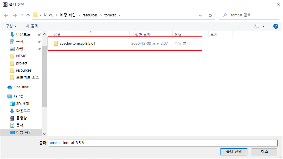 tomcat 폴더 선택한다.