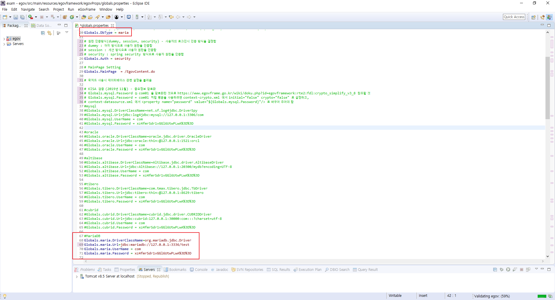 # Globals.mysql.Password = com01처럼 평문을 사용하려면 context-crypto.xml 에서 initial="false" crypto="false"로 설정하고,